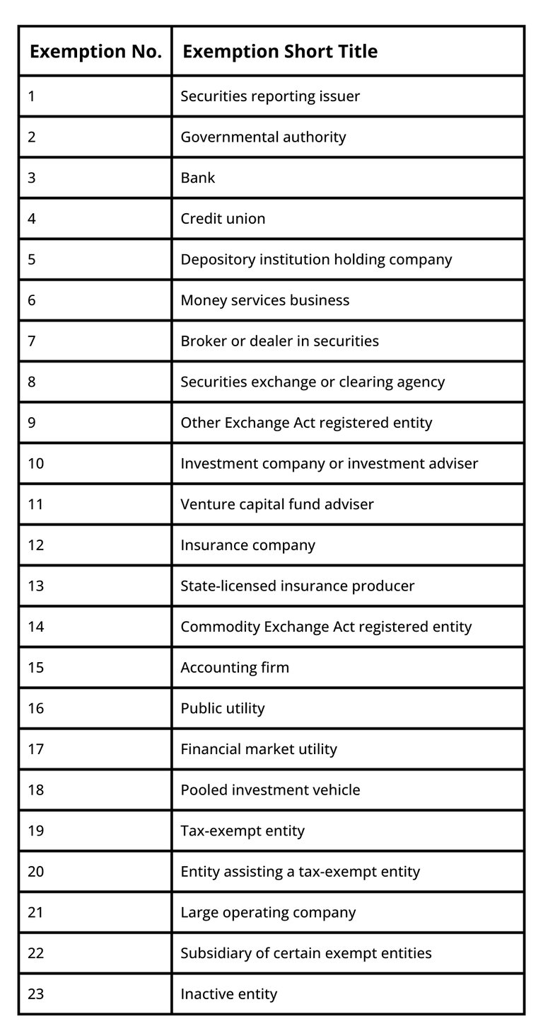 There’s also an exemption for "large operating companies." These are defined as companies that 1) have more than 20 full-time employees in the U.S., 2) operate from a physical office in the U.S., and 3) filed a federal tax return for the previous year reporting gross receipts or sales exceeding $5 million. The term "has an operating presence at a physical office within the United States" means that the entity regularly conducts its business at a physical location in the U.S. that it owns or leases, and this location is physically distinct from the business premises of any unaffiliated entity.